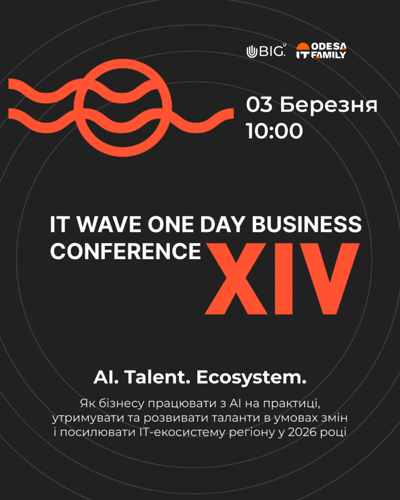 Ми раді знову підтримати ініціативу Odesa IT Family та запросити вас на конференцію IT Wave 2026, що відбудеться 3 березня в Одесі. Цьогорічна зустріч присвячена новому етапу розвитку ІТ-сектору Півдня. Головний фокус — на стратегічних рішеннях, які формують ринок уже сьогодні: від інтеграції AI у реальний бізнес до глобальної боротьби...